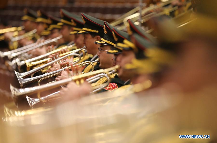 A military band plays the national anthem during the closing meeting of the third session of the 12th National Committee of the Chinese People's Political Consultative Conference (CPPCC) at the Great Hall of the People in Beijing, capital of China, March 13, 2015. (Xinhua/Xing Guangli)