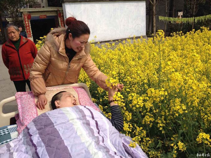 A woman takes her paralyzed husband in a movable sickbed to appreciate rape flowers in Deyang, southwest China's Sichuan province. The story was reported by the West China City Daily, a local newspaper on March 11, 2015. (Photo/WCCDaily)