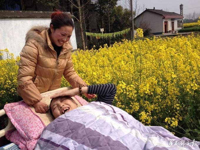 | A woman takes her paralyzed husband in a movable sickbed to appreciate rape flowers in Deyang, southwest China's Sichuan province. The story was reported by the West China City Daily, a local newspaper on March 11, 2015. (Photo/WCCDaily) |