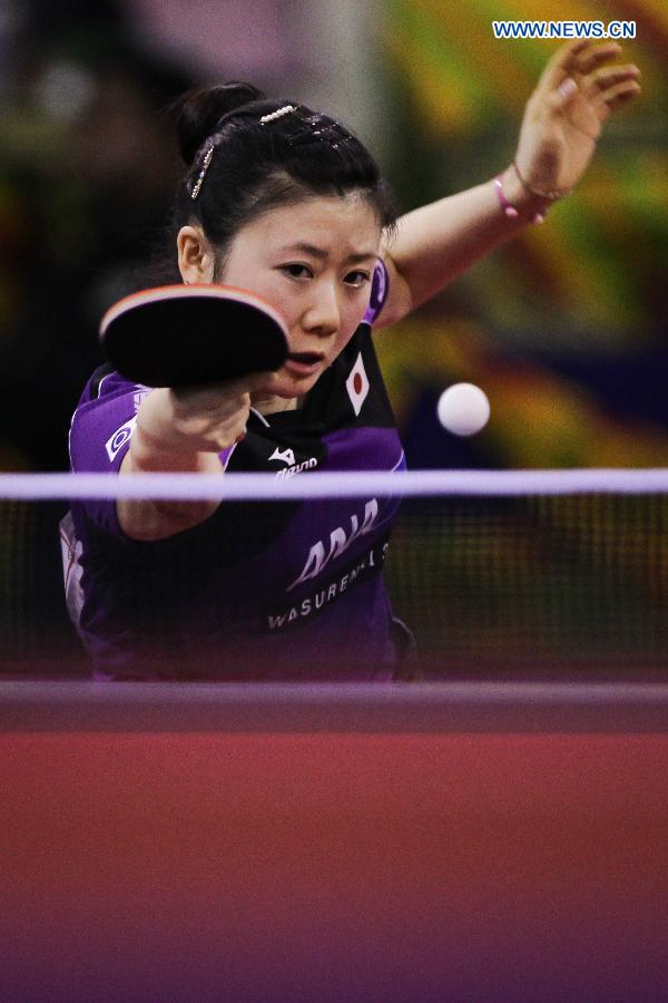 Fukuhara Ai of Japan returns a ball during women's singles semifinal match against Feng Tianwei of Singapore on the second day of the 28th Table Tennis Asian Cup in Jaipur, India, March 14, 2015. Fukuhara Ai lost 3-4. (Xinhua/Zheng Huansong)