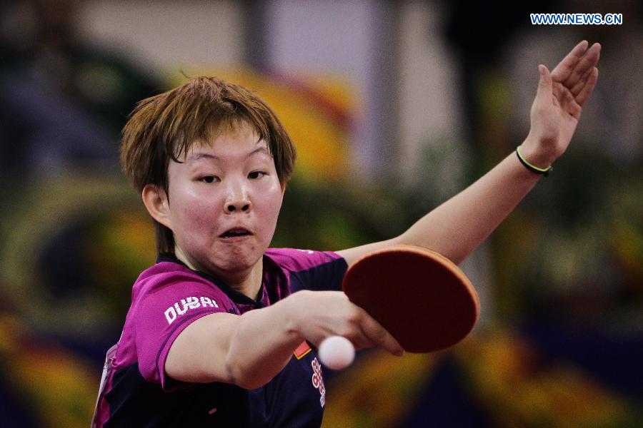 Zhu Yuling of China returns a ball during women's singles semifinal match against Liu Shiwen of China on the second day of the 28th Table Tennis Asian Cup in Jaipur, India, March 14, 2015. Liu Shiwen won 4-2. (Xinhua/Zheng Huansong)