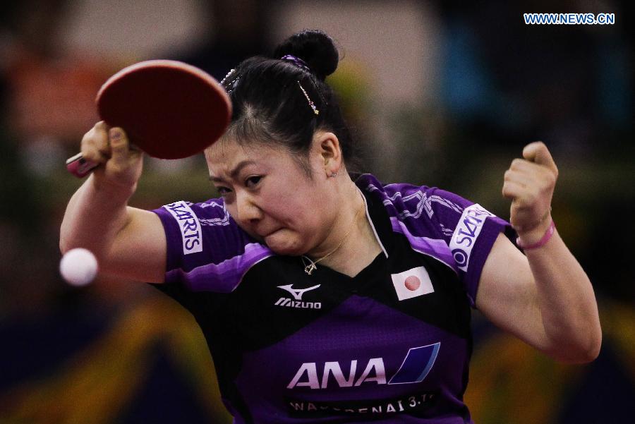 Fukuhara Ai of Japan returns a ball during women's singles semifinal match against Feng Tianwei of Singapore on the second day of the 28th Table Tennis Asian Cup in Jaipur, India, March 14, 2015. Fukuhara Ai lost 3-4. (Xinhua/Zheng Huansong)