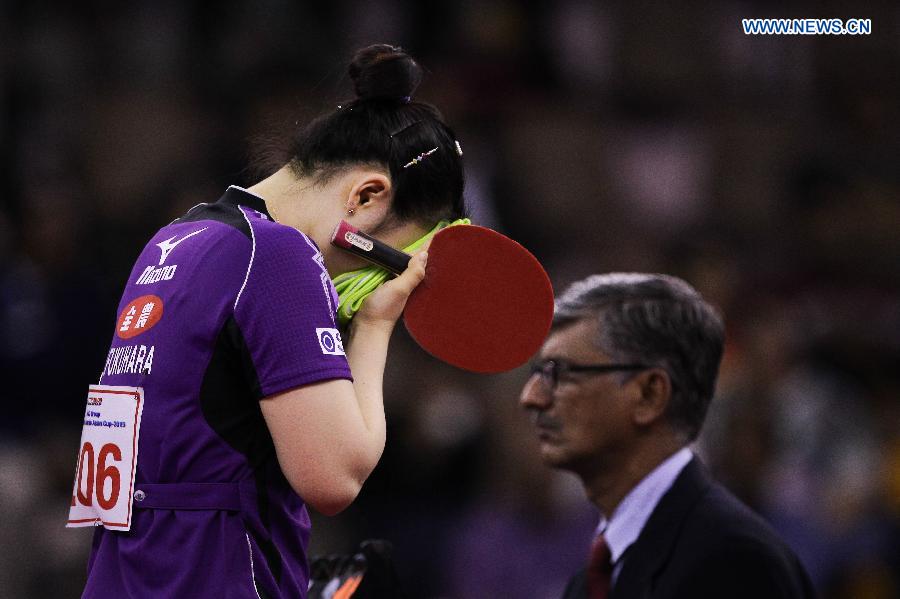 Fukuhara Ai of Japan returns a ball during women's singles semifinal match against Feng Tianwei of Singapore on the second day of the 28th Table Tennis Asian Cup in Jaipur, India, March 14, 2015. Fukuhara Ai lost 3-4. (Xinhua/Zheng Huansong)