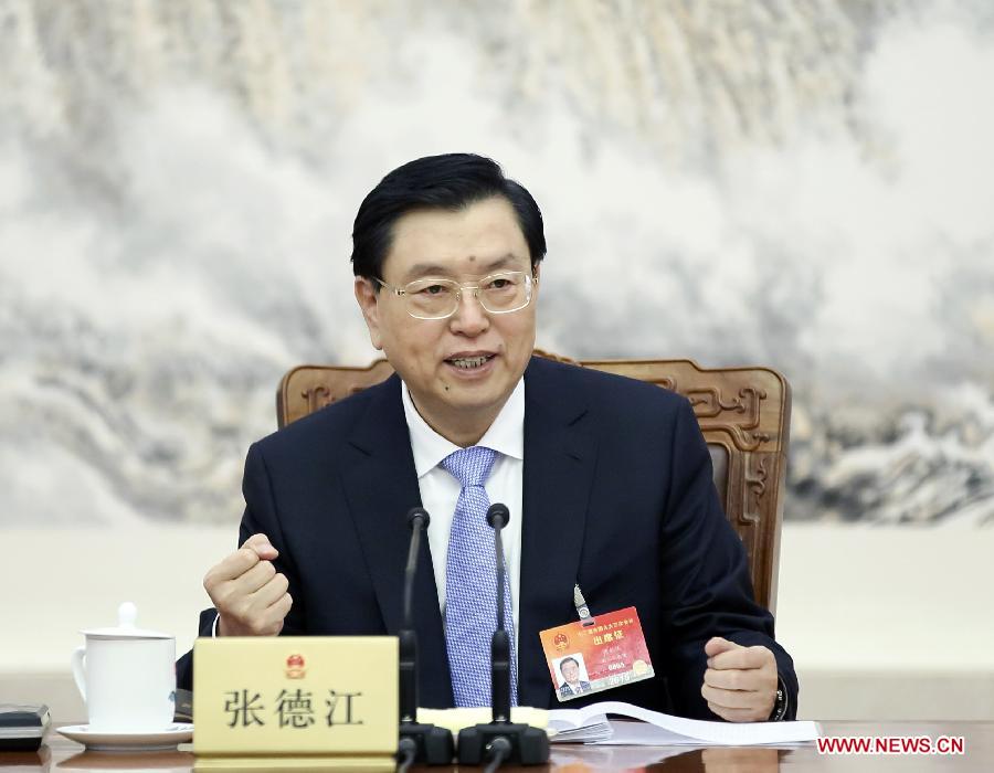| Zhang Dejiang, executive chairperson of the presidium of the third session of China's 12th National People's Congress (NPC) and chairman of the NPC Standing Committee, presides over the second meeting of the presidium's executive chairpersons at the Great Hall of the People in Beijing, capital of China, March 14, 2015. (Xinhua/Lan Hongguang) |