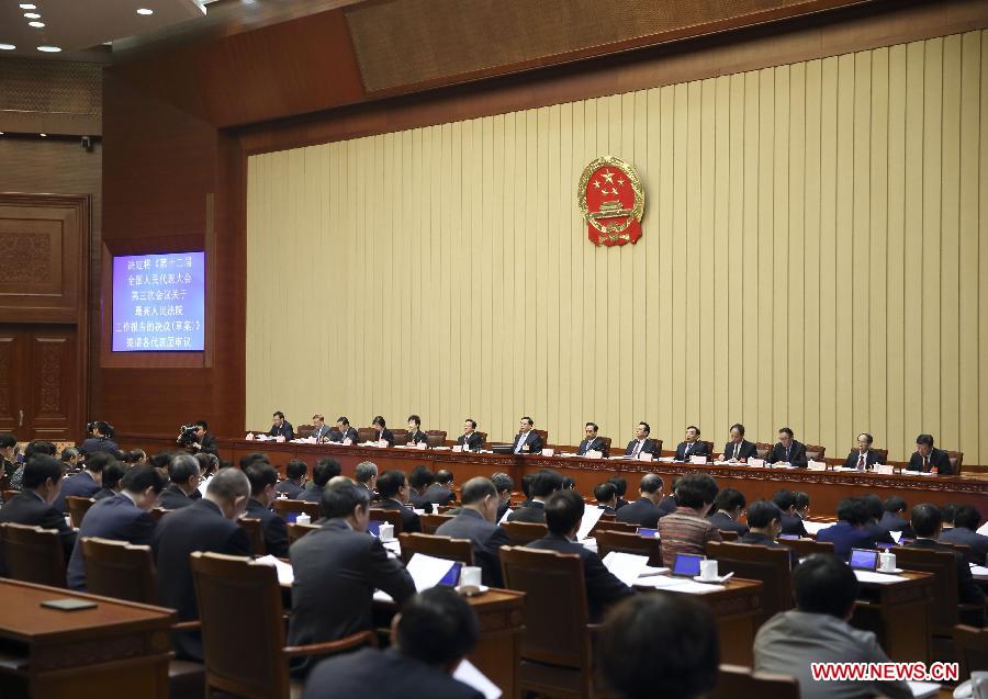 Zhang Dejiang, executive chairperson of the presidium of the third session of China's 12th National People's Congress (NPC), presides over the third meeting of the presidium at the Great Hall of the People in Beijing, capital of China, March 14, 2015. (Xinhua/Lan Honggguang)