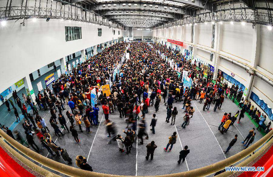 Job seekers attend a job fair held for fresh graduates in east China's Tianjin, March 14, 2015. About 1,800 opportunities were offered at the fair. (Xinhua/You Sixing)