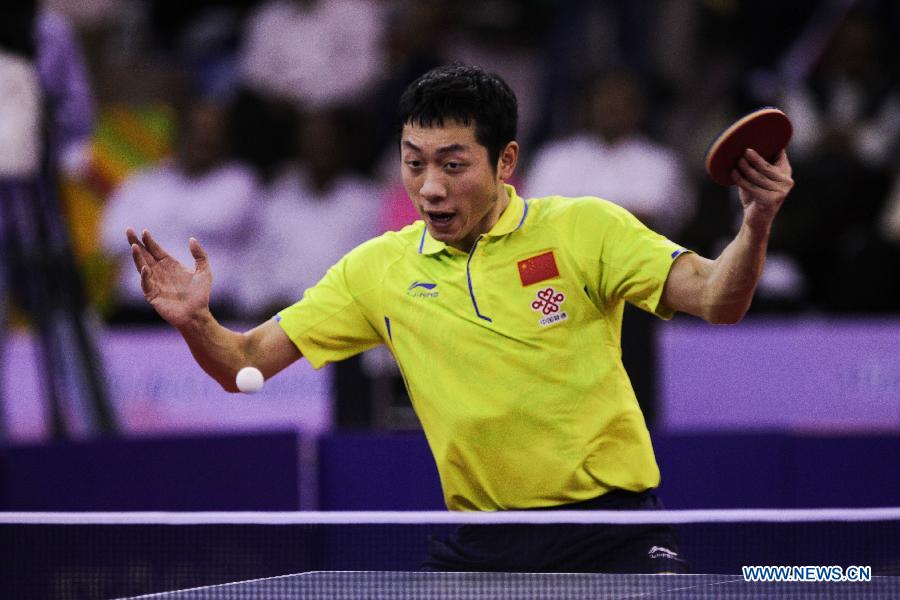 Xu Xin of China returns a ball during his men's singles final match against Fan Zhendong of China at the 28th Table Tennis Asian Cup in Jaipur, India, March 15, 2015. Xu Xin won 4-3 to claim the title. (Xinhua/Zheng Huansong)
