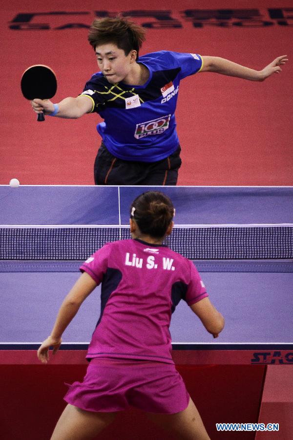 Feng Tianwei of Singapore (rear) returns a ball during her women's singles final match against Liu Shiwen of China at the 28th Table Tennis Asian Cup in Jaipur, India, March 15, 2015. Feng Tianwei won 4-3 to claim the title. (Xinhua/Zheng Huansong)