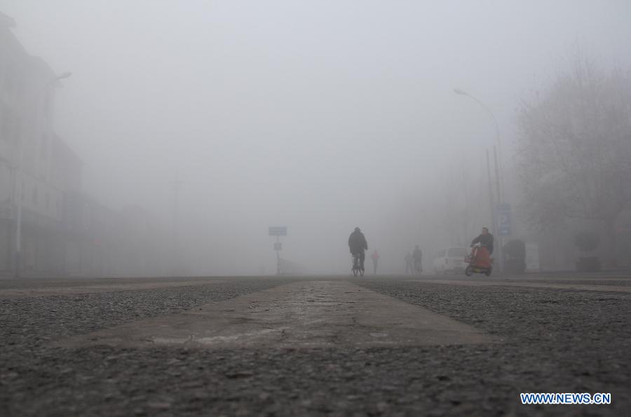 People ride in heavy fog in Zaozhuang City, east China's Shandong Province, March 16, 2015. A heavy fog hit parts of Zaozhuang Monday, lowering the visionbility to less than 100 meters.(Xinhua/Zhang Yanxin)