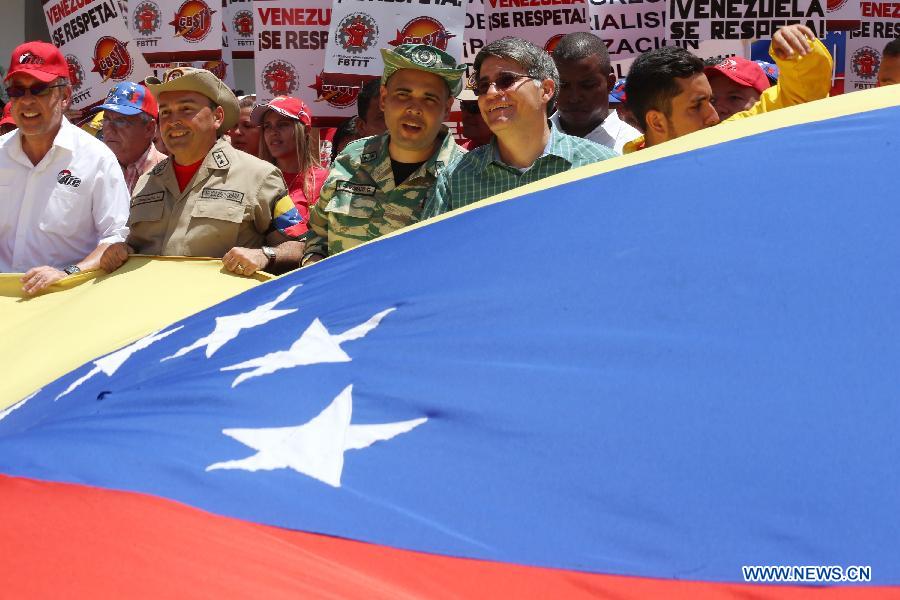 Railway workers take part in a march against the recent actions by the U.S. Government against Venezuela, in Caracas, Venezuela, on March 16, 2015. (Xinhua/Gregorio Teran/AVN)