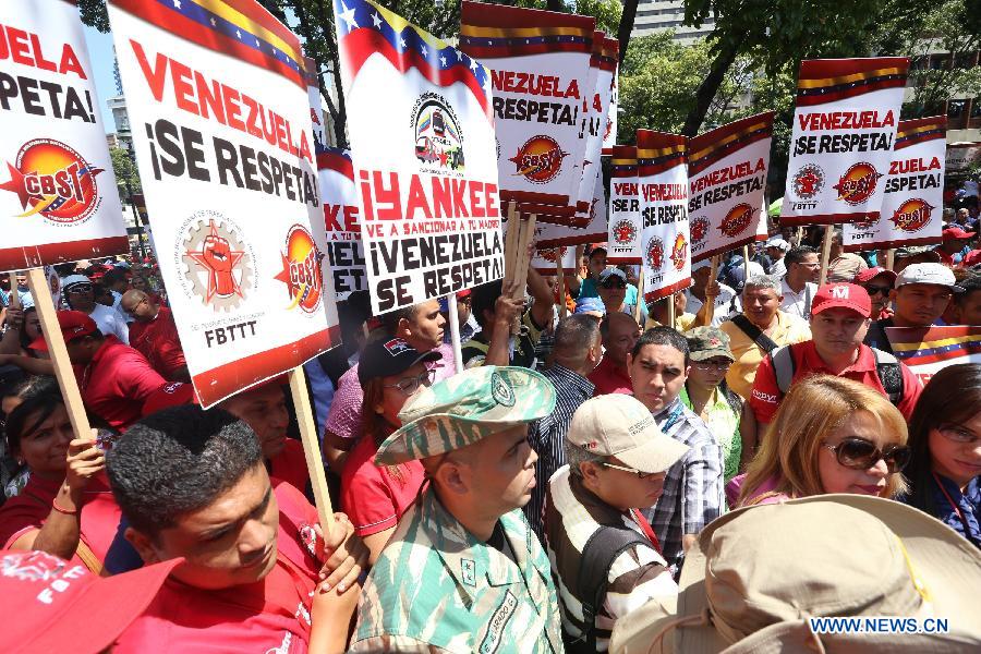 Railway workers take part in a march against the recent actions by the U.S. Government against Venezuela, in Caracas, Venezuela, on March 16, 2015. (Xinhua/Gregorio Teran/AVN)