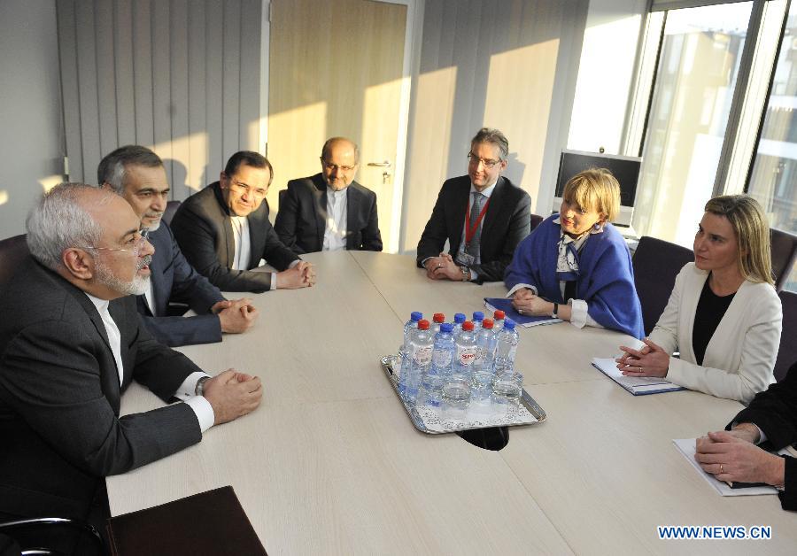 EU High Representative for Foreign Affairs and Security Policy Federica Mogherini (1st R) and Iran's Foreign Minister Mohammad Javad Zarif (1st L) hold bilateral meeting in Brussels, Beglium, March 16, 2015. (Xinhua/Ye Pingfan)
