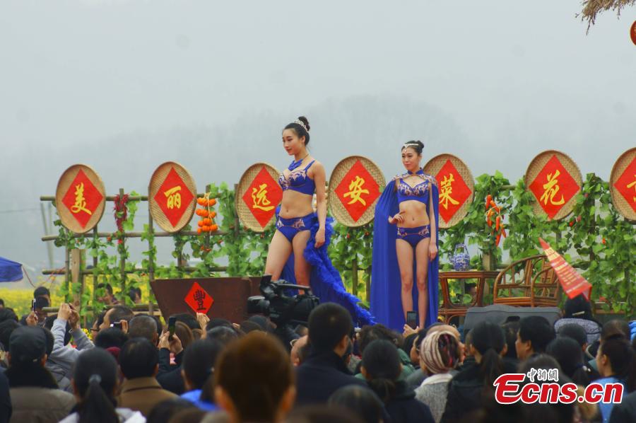 Models walk the runway in a countryside fashion show during the second Rapeseed Festival in Yuan’an county, Yichang city, Central China’s Hubei province, March 14, 2015. The blooming flowers make Yuan’an county a destination for tourists to go for a spring outing. (Photo: China News Service/Zhou Jianping)