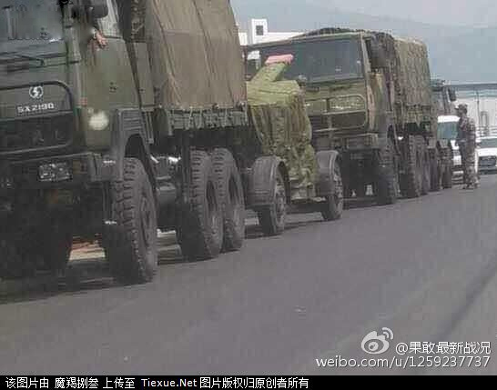 Long queues of military trucks and missile carriers are said to have stationed on the China-Myanmar border on March 15, 2015. [Photo: weibo account of "guo gan zui xin zhan kuang"]