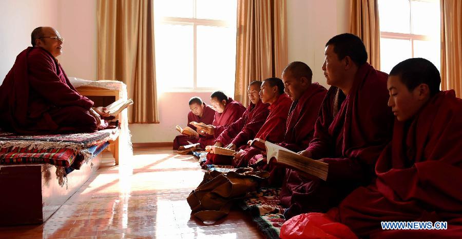 Monks attend a class of Buddhist Theory at the Yunnan Institute of Buddhist Studies Diqing Branch in Shangri-la County, southwest China's Yunnan Province, March 16, 2015. Located at an altitude of 3,300 meters, Yunnan Institute of Buddhist Studies Diqing Branch is an important school of Tibetan Buddhism in Yunnan. Established in 2005, the institute now has a total of 68 monks, who are from some monasteries in Yunnan, Sichuan and Tibet. Besides daily chanting sutras, monks here also take classes such as Tibetan language, Chinese, Buddhist Theory, Politics, English and Computer. (Xinhua/Lin Yiguang)