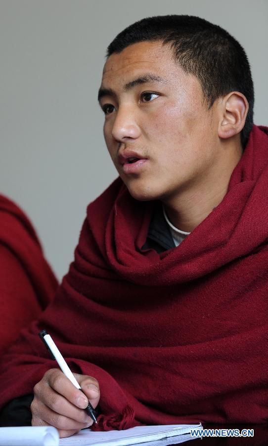 File photo taken on March 14, 2011 shows monk Norsang Drakpa attending a class of Tibetan language at the Yunnan Institute of Buddhist Studies Diqing Branch in Shangri-la County, southwest China's Yunnan Province. Located at an altitude of 3,300 meters, Yunnan Institute of Buddhist Studies Diqing Branch is an important school of Tibetan Buddhism in Yunnan. Established in 2005, the institute now has a total of 68 monks, who are from some monasteries in Yunnan, Sichuan and Tibet. Besides daily chanting sutras, monks here also take classes such as Tibetan language, Chinese, Buddhist Theory, Politics, English and Computer. (Xinhua/Lin Yiguang)