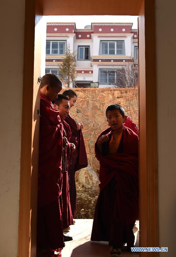 Monks chat after class at the Yunnan Institute of Buddhist Studies Diqing Branch in Shangri-la County, southwest China's Yunnan Province, March 16, 2015. Located at an altitude of 3,300 meters, Yunnan Institute of Buddhist Studies Diqing Branch is an important school of Tibetan Buddhism in Yunnan. Established in 2005, the institute now has a total of 68 monks, who are from some monasteries in Yunnan, Sichuan and Tibet. Besides daily chanting sutras, monks here also take classes such as Tibetan language, Chinese, Buddhist Theory, Politics, English and Computer. (Xinhua/Lin Yiguang)