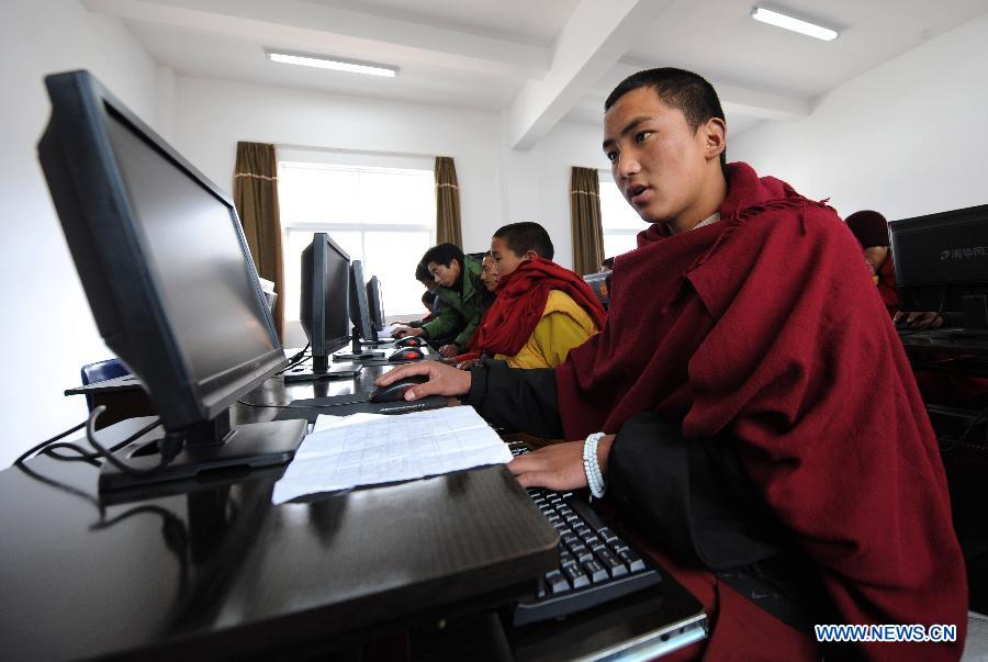 File photo taken on March 14, 2011 shows monk Norsang Drakpa (R) attending a computer class at the Yunnan Institute of Buddhist Studies Diqing Branch in Shangri-la County, southwest China's Yunnan Province. Located at an altitude of 3,300 meters, Yunnan Institute of Buddhist Studies Diqing Branch is an important school of Tibetan Buddhism in Yunnan. Established in 2005, the institute now has a total of 68 monks, who are from some monasteries in Yunnan, Sichuan and Tibet. Besides daily chanting sutras, monks here also take classes such as Tibetan language, Chinese, Buddhist Theory, Politics, English and Computer. (Xinhua/Lin Yiguang)