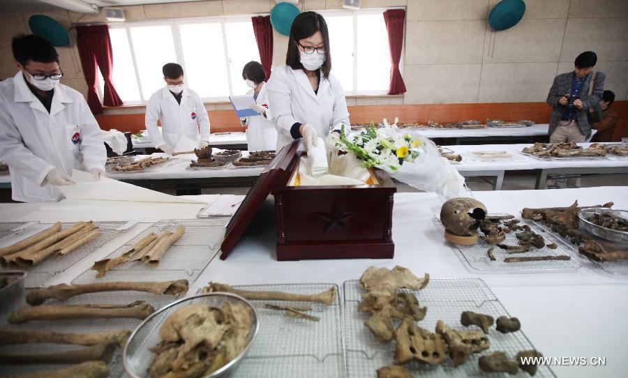 South Korean workers prepare the remains of Chinese soldiers who died in the Korean War, in Paju, South Korea, March 16, 2015. The remains of 68 Chinese soldiers will be flown back to China after a handover ceremony at Incheon Airport on March 20.(Xinhua/Yao Qilin)