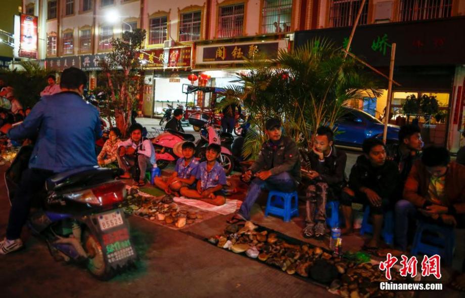 Some Myanmar merchant sell gems at Delong jewelry night market in Ruili on Mar.9. (CNS/Zhang Hao)