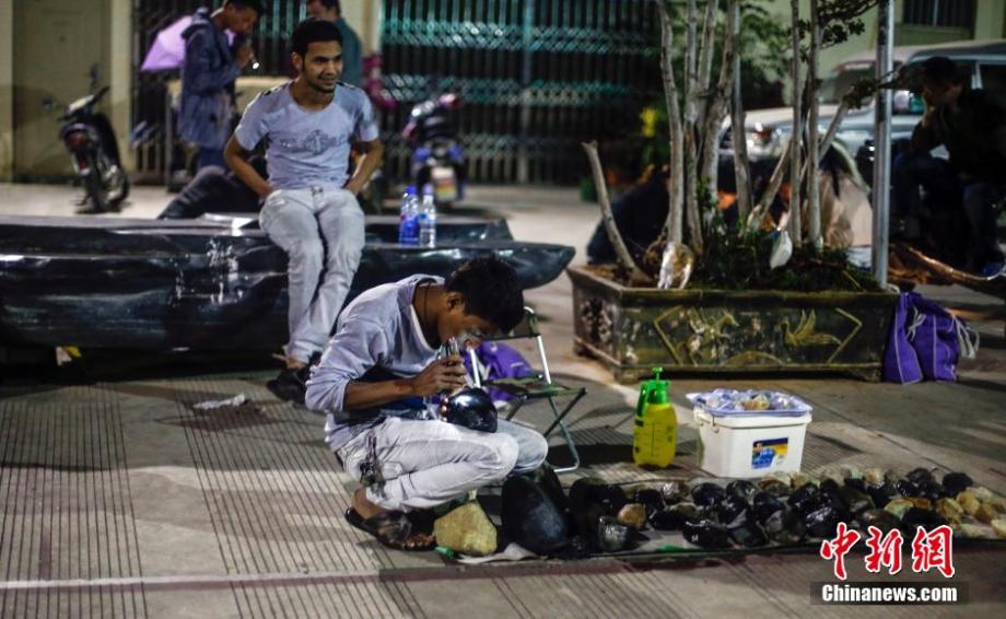 A Burmese gem trader checks the stone quality at Delong jewelry night market in Ruili on Mar.9. (CNS/Zhang Hao)