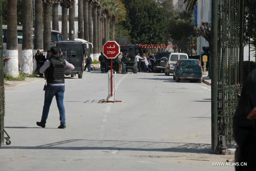 Tourists get on a bus under the cover of police at Bardo Museum after an armed attack on the museum in Tunis, Tunisia, on March 18, 2015. At least 19 people were killed, including 17 tourists, in the attack on Wednesday, Tunisia's Prime Minister Habib Essid said. (Xinhua/Adel)