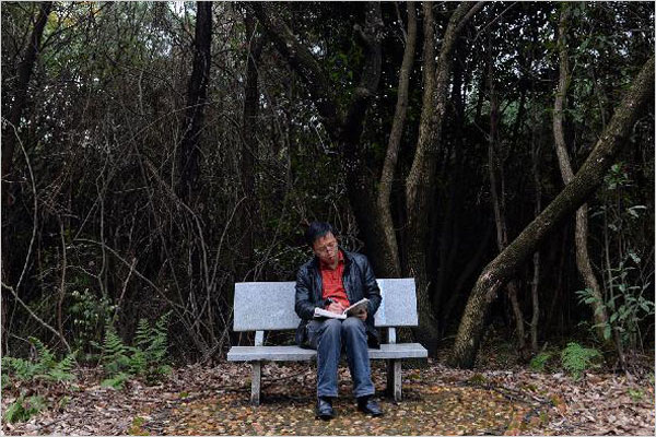 Gan reads a book in a wood at the university. [Photo: Xinhua]