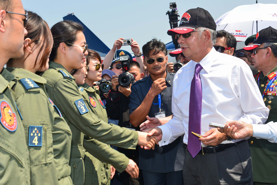 Malaysian Prime Minister Najib Tun Razak (right) shakes hands with Chinese female pilots. (Xinhua/Zhang Wenzong)