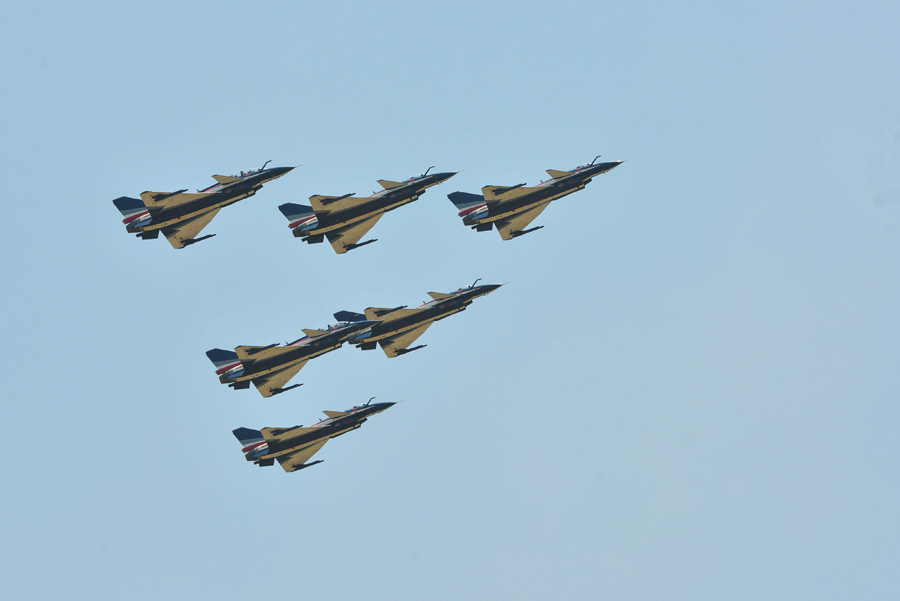 Bayi Aerobatic Team of the Air Force of the Chinese People's Liberation Army performs in LIMA on March 17, 2015. (Xinhua/Zhang Wenzong)