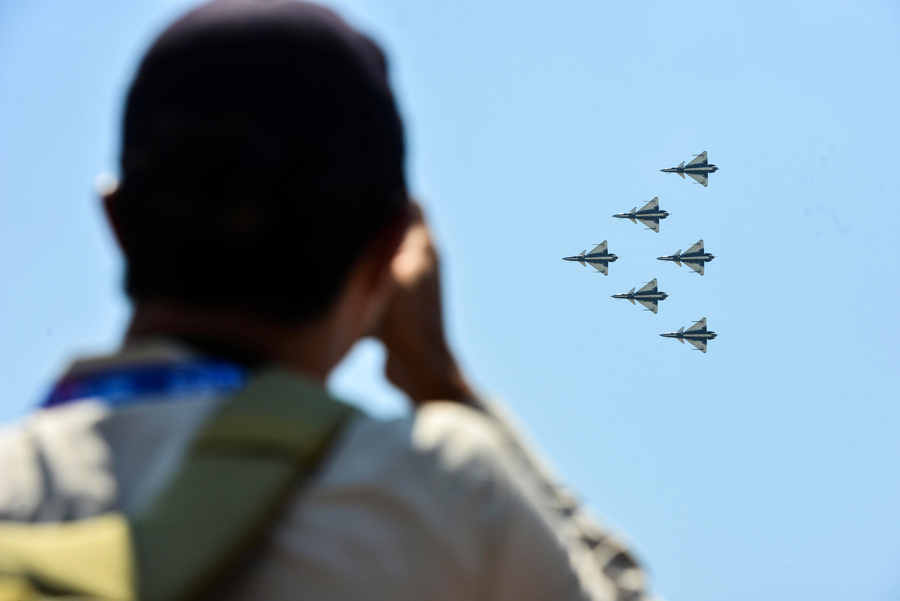Bayi Aerobatic Team of the Air Force of the Chinese People's Liberation Army performs in LIMA on March 17, 2015. (Xinhua/Zhang Wenzong)