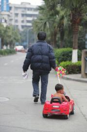 | Lajier sits in a toy car naked. (Photo /Sun Peike) |