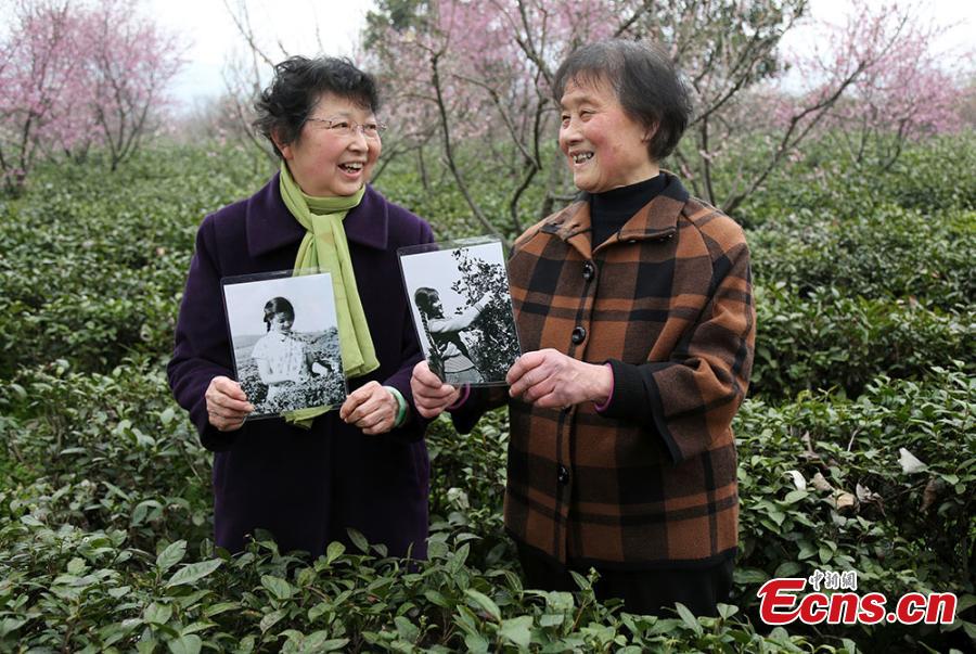 Women return to their old workplace 57 years after departing it to recollect their old days of picking tealeaves in the organic tea gardens of the Sun Yat-sen Mausoleum, Nanjing city, East China's Jiangsu province, March 19, 2015. (Photo: China News Service/ Gao Wei)