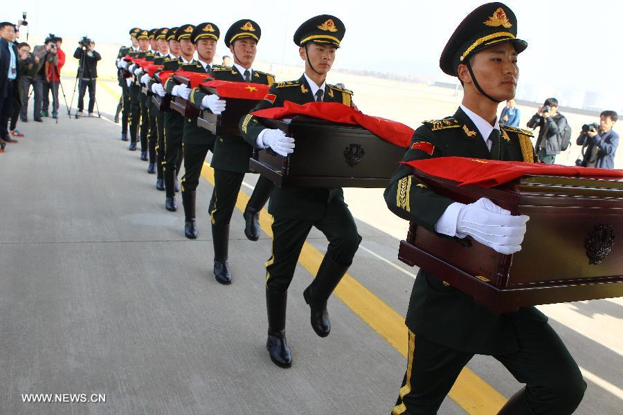 Soldiers of the Chinese People's Liberation Army carry coffins containing remains of soldiers of the Chinese People's Volunteers (CPV) dead in the 1950-53 Korean War, during a handover ceremony at the Inchon International Airport of South Korea, March 20, 2015. (Xinhua/Yao Qilin)