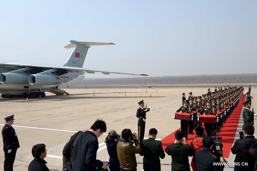| Soldiers of the Chinese People's Liberation Army carry coffins containing remains of soldiers of the Chinese People's Volunteers (CPV) dead in the 1950-53 Korean War, at the Taoxian International Airport in Shenyang, capital of northeast China's Liaoning Province, March 20, 2015. South Korea on Friday handed over to China the remains of 68 CPV soldiers dead in the Korean War. (Xinhua/Shen Ling) (wyo) |