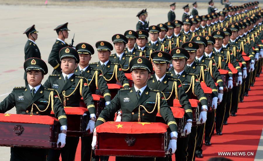 Soldiers of the Chinese People's Liberation Army carry coffins containing remains of soldiers of the Chinese People's Volunteers (CPV) dead in the 1950-53 Korean War, at the Taoxian International Airport in Shenyang, capital of northeast China's Liaoning Province, March 20, 2015. South Korea on Friday handed over to China the remains of 68 CPV soldiers dead in the Korean War. (Xinhua/Shen Ling)