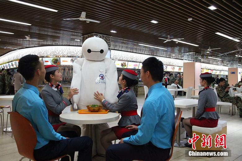 Photos of a flight attendant trainee in Baymax costume serving passengers have gone viral online. Baymax, a cute inflatable robot in recent animated feature film Big Hero 6, have won many Chinese people’s hearts. (Photo/ Zhong Xin)