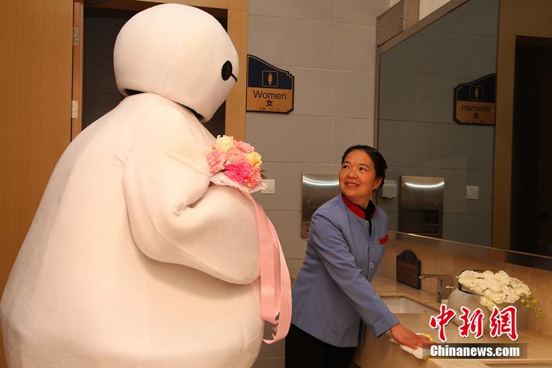 Photos of a flight attendant trainee in Baymax costume serving passengers have gone viral online. Baymax, a cute inflatable robot in recent animated feature film Big Hero 6, have won many Chinese people’s hearts. (Photo/ Zhong Xin)
