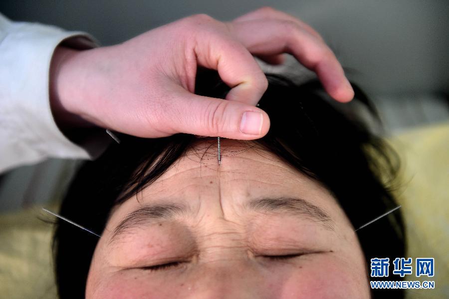 | A patient with sleep impairment gets traditional Chinese acupuncture treatment in Jinan, east China's Shandong province on March 20, 2015. (Xinhua/Guo Xulei) |