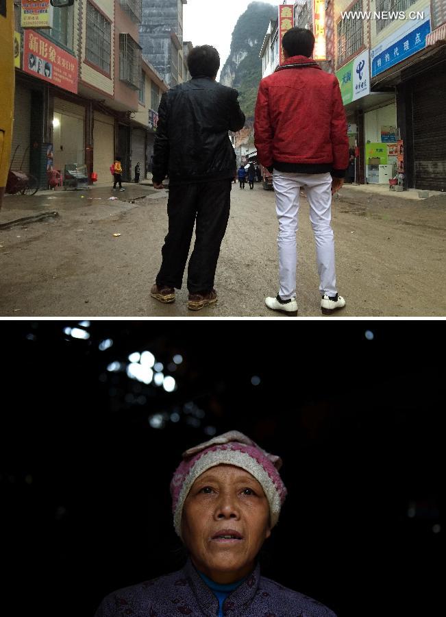 The combined photo taken on March 11, 2015 shows Meng Guifang and his brother Meng Guixin (upper) waiting for their coach in Bansheng County, south China's Guangxi Zhuang Autonomous Region, and their mother Lan Meiyun (lower) standing at the gate of their house. Nongding and Nongchao Villages are located in Bansheng County, a poor rural area of uninhabitable karst topography in Guangxi. After a short family reunion of the spring festival, young people of the two villages left their hometown again. Because of the topography and the weather, both of the two villages are unsuitable for farming. Working in east or south China's modern cities has become a major source of income for many local families and a preference for most young people. After helping their aged parents plant corns, some of them have to leave home at midnight to catch a coach in the countyseat to their faraway working places. (Xinhua/Huang Xiaobang)