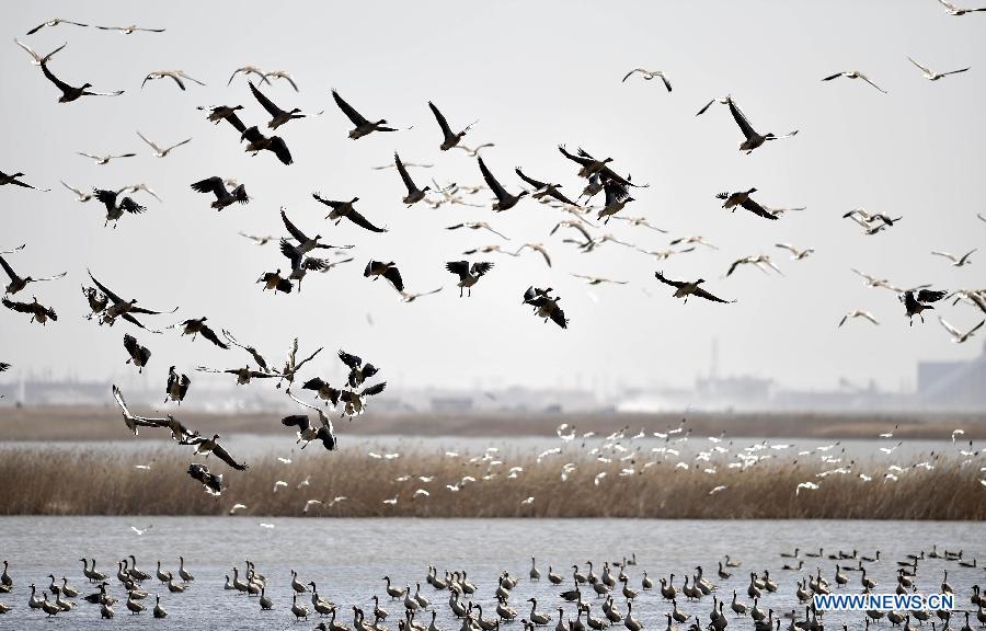 Birds fly at the Beidagang wetland in Tianjin, north China, March 21, 2015. The wetland's administrative staff recorded more than 6,000 migrant birds here, as the weather gets warmer. (Xinhua/Yue Yuewei)
