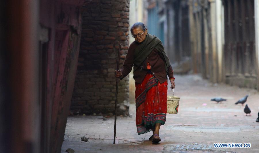 An elderly woman returns with a bucket of water from a tap nearby on the World Water Day in Kathmandu, Nepal, March 22, 2015. World Water Day is observed annually to bring the awareness globally to save, conserve and manage water resources for future generations. (Xinhua/Sunil Sharma)