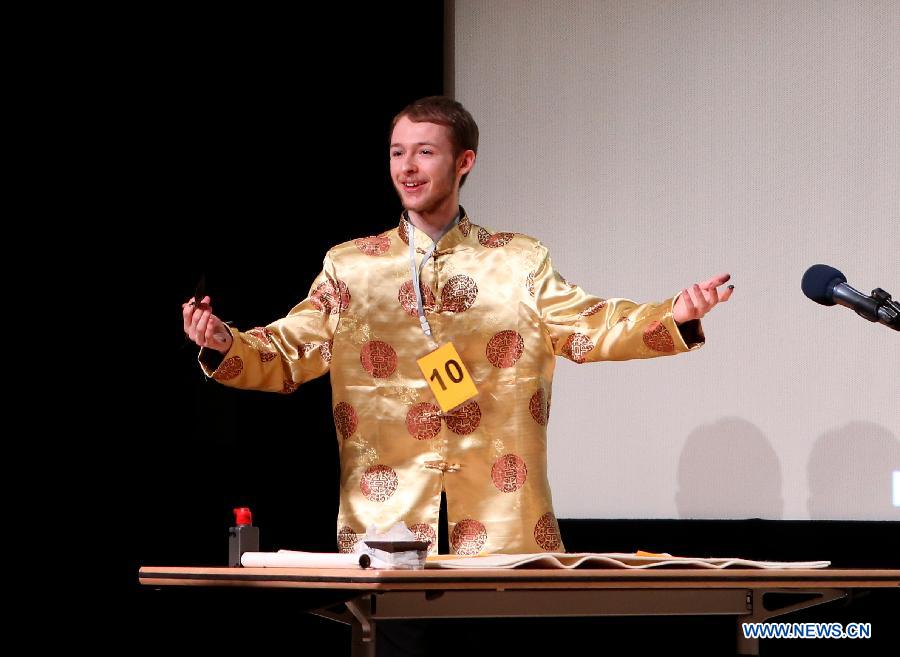 Cameron Patterson from Lancaster University performs during the final of the 14th "Chinese Bridge" Chinese Proficiency Competition UK 2015 held in British Library Conference Center in London, Britain, on March 21, 2015. (Xinhua/Han Yan)