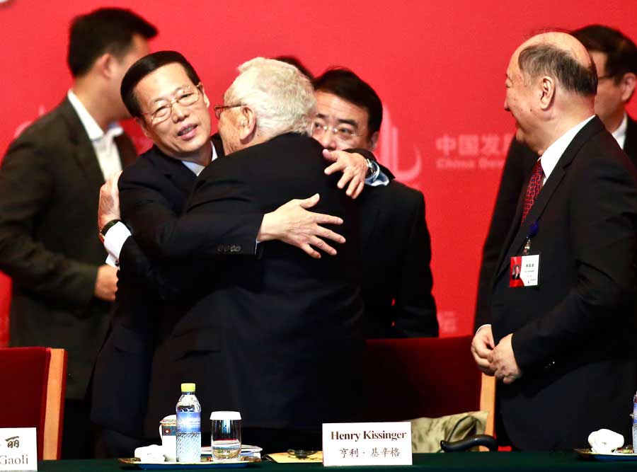 Vice Premier Zhang Gaoli greets former US Secretary of State Henry Kissinger at China Development Forum 2015, Mar 22, 2015. [Feng Yongbin / chinadaily.com.cn]
