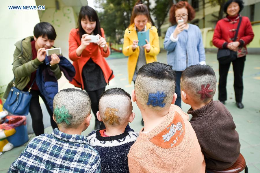 Children pose for a group photo after having special haircuts in Hefei, capital of east China's Anhui Province, March 21, 2015. March 21 is the second day of the second month in traditional Chinese lunar calendar this year. Folklore addresses it as "dragon lifting head", meaning the spring awakens after winter hibernation, when people usually have a haircut to bring good luck.(Xinhua/Zhang Duan)