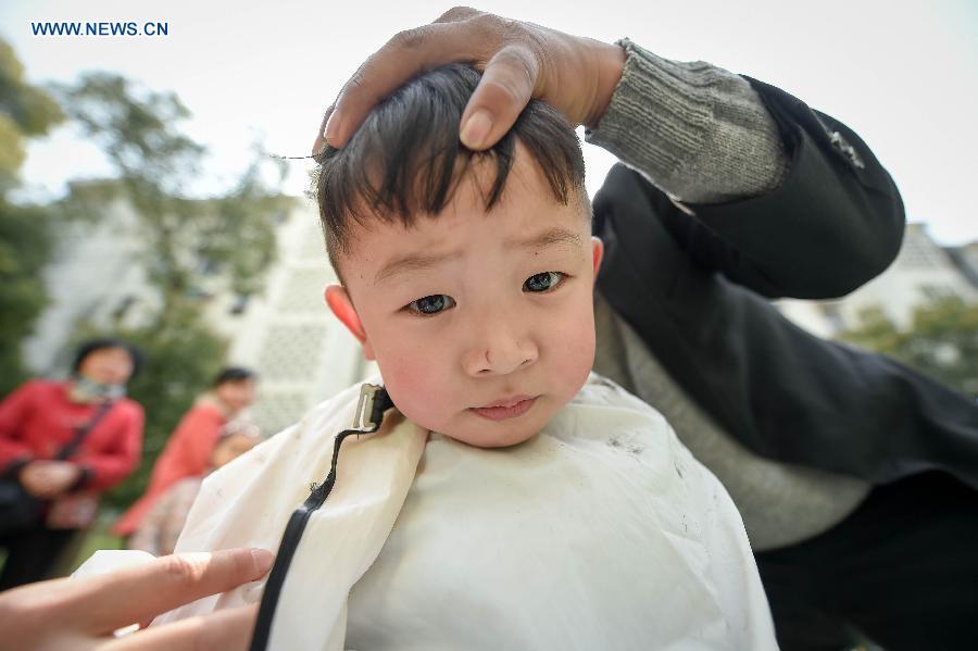 A child has a free haircut in Hefei, capital of east China's Anhui Province, March 21, 2015. March 21 is the second day of the second month in traditional Chinese lunar calendar this year. Folklore addresses it as "dragon lifting head", meaning the spring awakens after winter hibernation, when people usually have a haircut to bring good luck. (Xinhua/Zhang Duan)