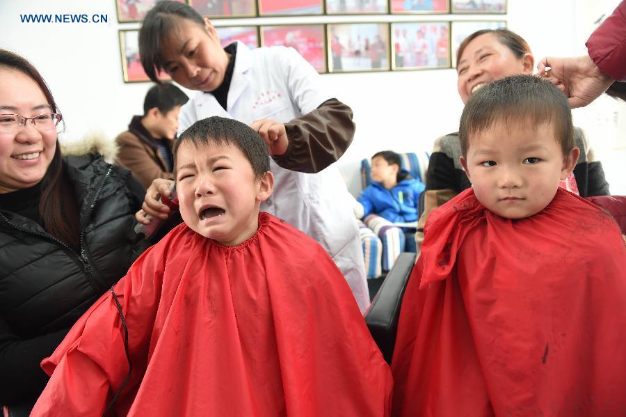 A pair of twins have free haircut in Hefei, capital of east China's Anhui Province, March 21, 2015. March 21 is the second day of the second month in traditional Chinese lunar calendar this year. Folklore addresses it as "dragon lifting head", meaning the spring awakens after winter hibernation, when people usually have a haircut to bring good luck. (Xinhua/Liu Junxi)