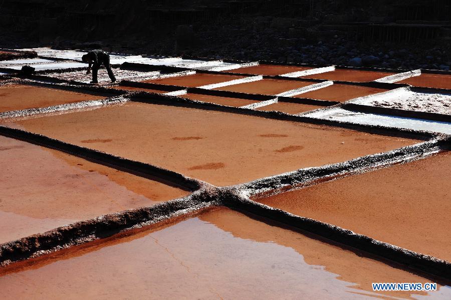A villager works on salt pans in Markam County, southwest China's Tibet Autonomous Region, March 21, 2015. Markam county, with rich salt resources, has more than 3,000 salt pans to evaporate brine in the sun with an ancestral technique since Tang Dynasty (618-907AD), which is also the oldest method of salt production. This salt evaporation method was listed as one of China's National Intangible Cultural Heritage in 2009. (Xinhua/Zhang Xiaohua)