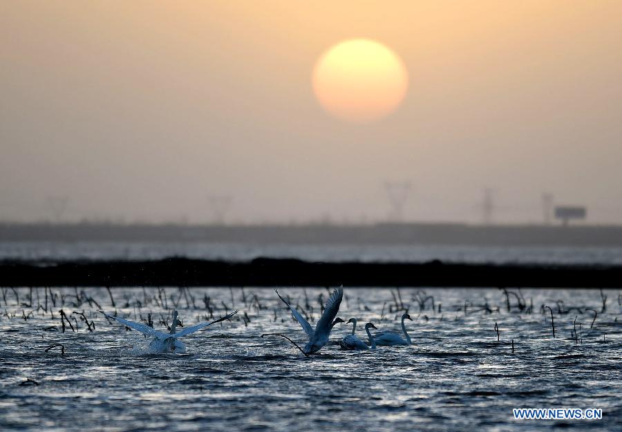Swans search for food on the Yellow River in Dalate Banner, north China's Inner Mongolia Autonomous Region, March 22, 2015. Millions of migratory birds from southern China will rest here for about a month before they migrate to Siberia in Russia. (Xinhua/Ren Junchuan)