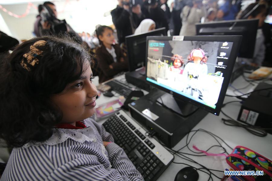 A Palestinian student attends a lesson in a computer laboratory at a UN-run school which is reopened after it was damaged during the war between Israel and Hamas militants in Khuzaa village of the southern Gaza Strip city of Khan Yunis, on March 22, 2015. (Xinhua/Khaled Omar)