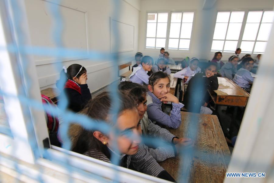 Palestinian students attend a lesson at a UN-run school which is reopened after it was damaged during the war between Israel and Hamas militants in Khuzaa village of the southern Gaza Strip city of Khan Yunis, on March 22, 2015. (Xinhua/Khaled Omar)